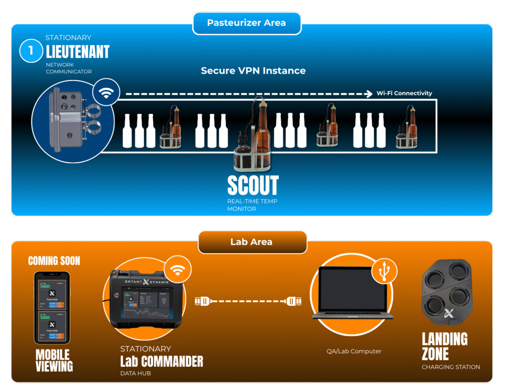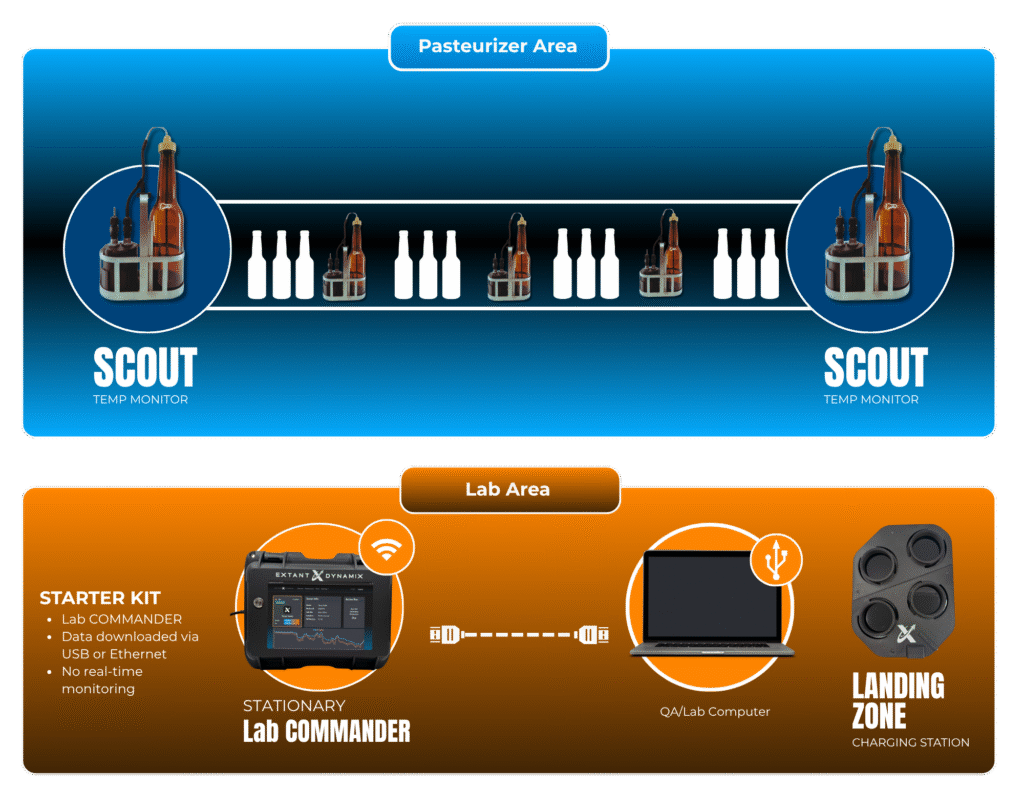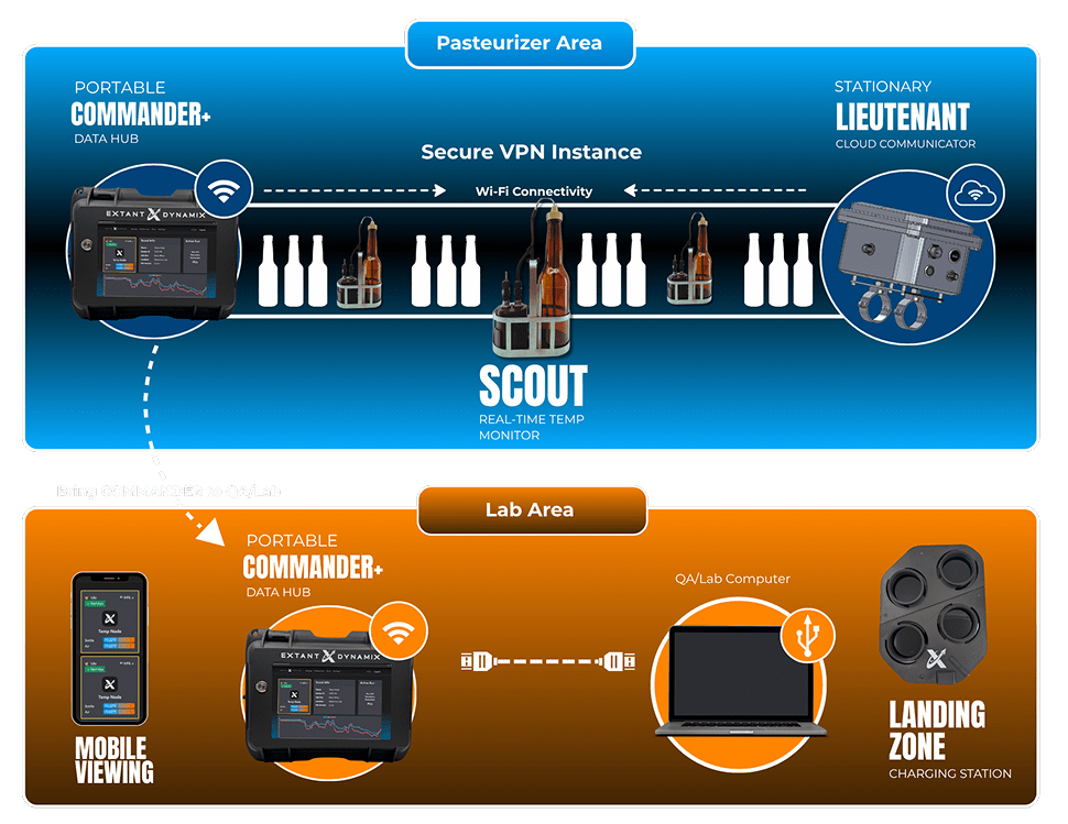 A high-volume configuration with 1 stationary LIEUTENANT unit positioned on each end of the pasteurizer, while the Lab COMMANDER remains in the QA/Lab.